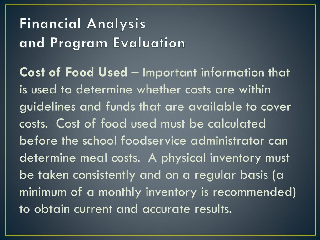 Financial Analysis and Program Evaluation Cost of Food Used – Important information that is used to determine whether costs are within guidelines and funds that are available to cover costs. Cost of food used must be calculated before the school foodservice administrator can determine meal costs. A physical inventory must be taken consistently and on a regular basis (a minimum of a monthly inventory is recommended) to obtain current and accurate results.