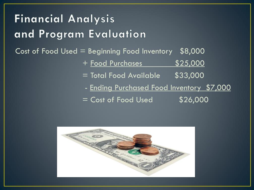 Financial Analysis and Program Evaluation Cost of Food Used = Beginning Food Inventory $8,000 + Food Purchases $25,000 = Total Food Available $33,000 - Ending Purchased Food Inventory $7,000 = Cost of Food Used $26,000