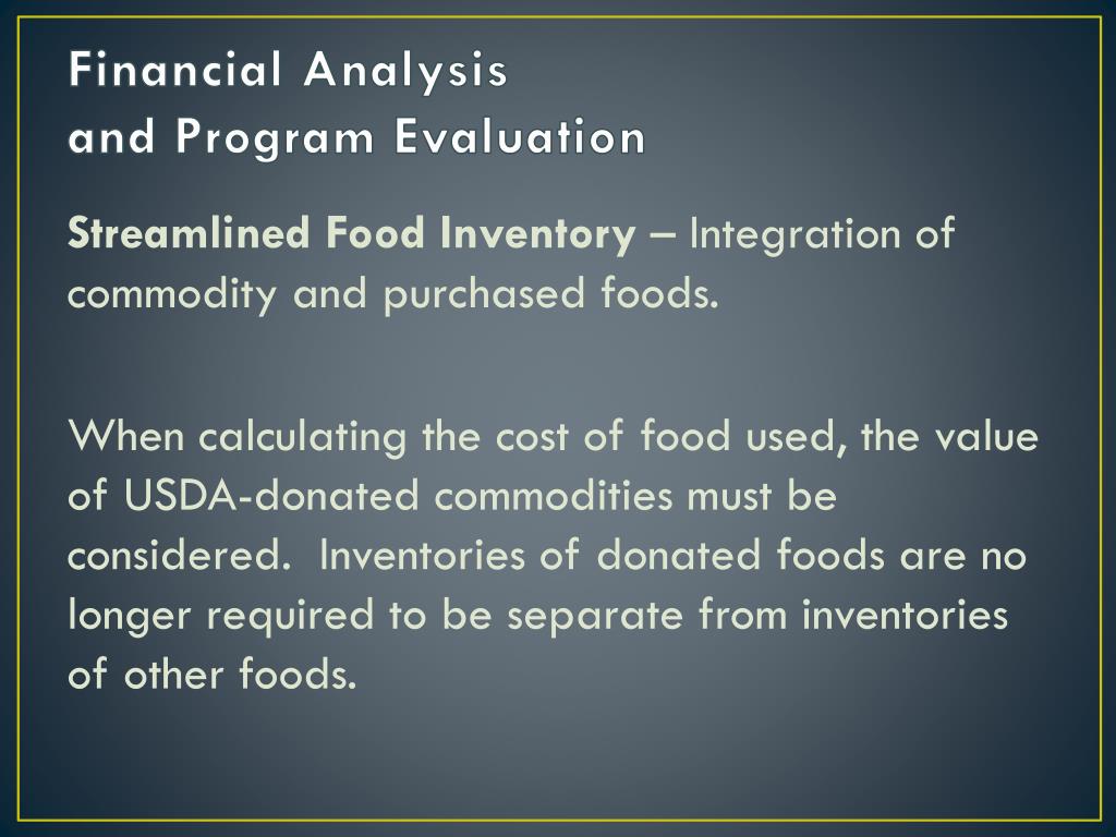 Financial Analysis and Program Evaluation Streamlined Food Inventory – Integration of commodity and purchased foods. When calculating the cost of food used, the value of USDA-donated commodities must be considered. Inventories of donated foods are no longer required to be separate from inventories of other foods.