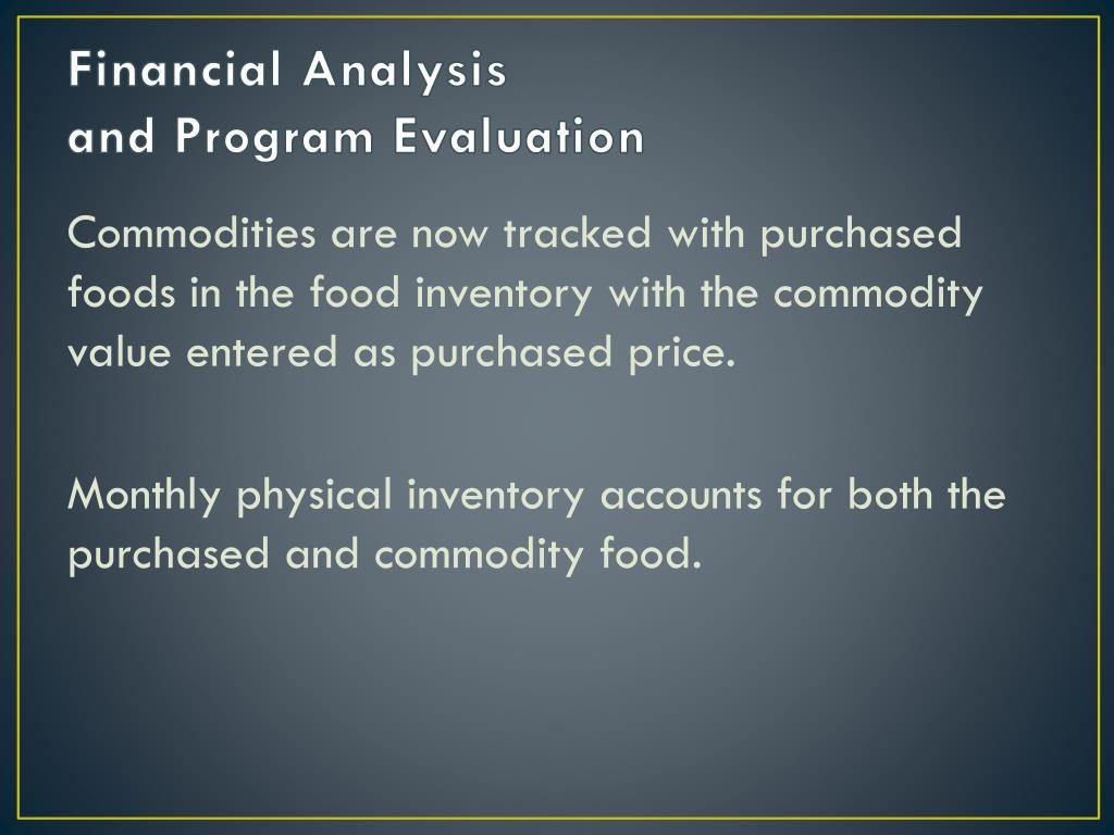 Financial Analysis and Program Evaluation Commodities are now tracked with purchased foods in the food inventory with the commodity value entered as purchased price. Monthly physical inventory accounts for both the purchased and commodity food.