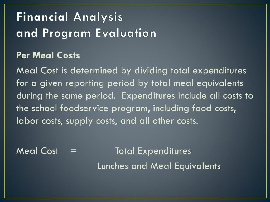 Financial Analysis and Program Evaluation Per Meal Costs Meal Cost is determined by dividing total expenditures for a given reporting period by total meal equivalents during the same period. Expenditures include all costs to the school foodservice program, including food costs, labor costs, supply costs, and all other costs. Meal Cost = Total Expenditures Lunches and Meal Equivalents
