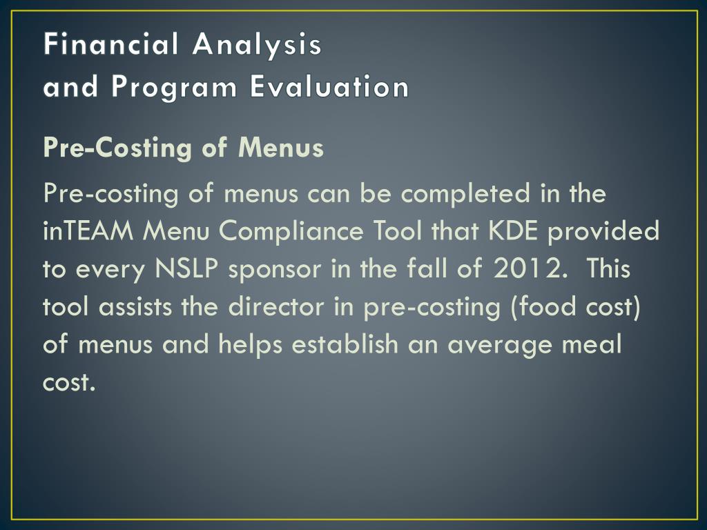 Financial Analysis and Program Evaluation Pre-Costing of Menus Pre-costing of menus can be completed in the inTEAM Menu Compliance Tool that KDE provided to every NSLP sponsor in the fall of 2012. This tool assists the director in pre-costing (food cost) of menus and helps establish an average meal cost.