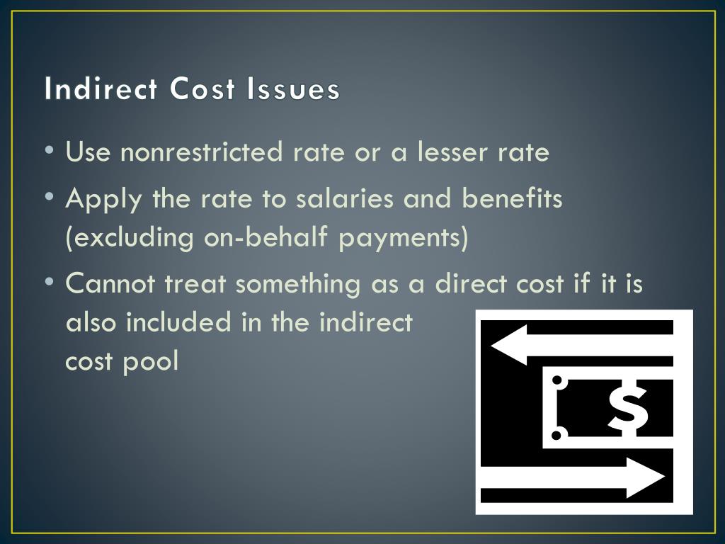 Indirect Cost Issues • Use nonrestricted rate or a lesser rate • Apply the rate to salaries and benefits (excluding on-behalf payments) • Cannot treat something as a direct cost if it is also included in the indirect cost pool