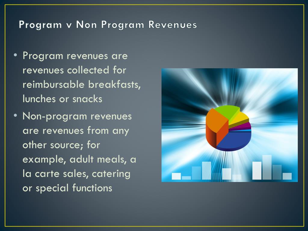Program v Non Program Revenues • Program revenues are revenues collected for reimbursable breakfasts, lunches or snacks • Non-program revenues are revenues from any other source; for example, adult meals, a la carte sales, catering or special functions