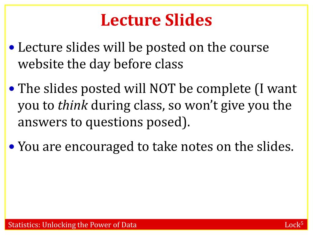 Lecture Slides • Lecture slides will be posted on the course website the day before class • The slides posted will NOT be complete (I want you to think during class, so won’t give you the answers to questions posed). • You are encouraged to take notes on the slides.