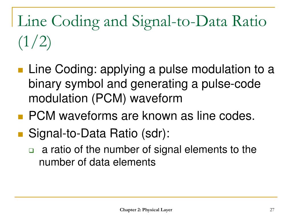 Line Coding and Signal-to-Data Ratio (1/2) • Line Coding: applying a pulse modulation to a binary symbol and generating a pulse-code modulation (PCM) waveform • PCM waveforms are known as line codes. • Signal-to-Data Ratio (sdr): • a ratio of the number of signal elements to the number of data elements Chapter 2: Physical Layer