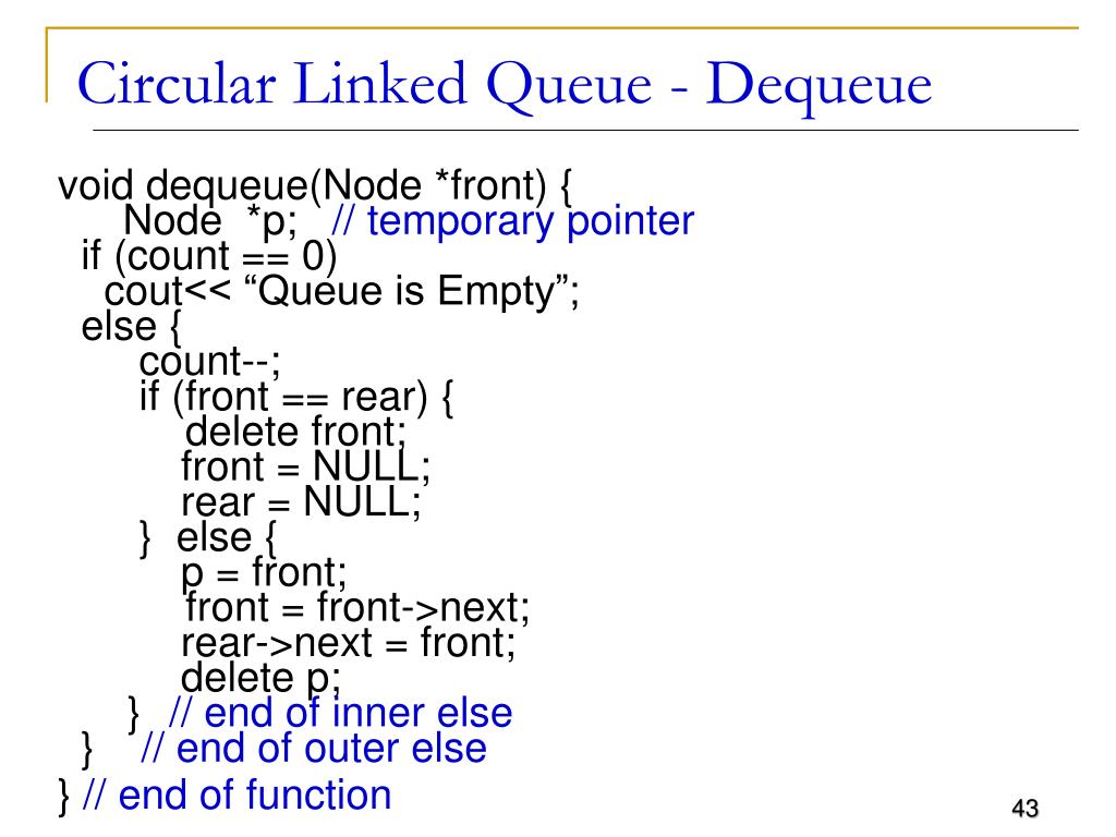 void dequeue(Node *front) { Node *p; // temporary pointer if (count == 0) cout<< “Queue is Empty”; else { count--; if (front == rear) { delete front; front = NULL; rear = NULL; } else { p = front; front = front->next; rear->next = front; delete p; } // end of inner else } // end of outer else }// end of function Circular Linked Queue - Dequeue