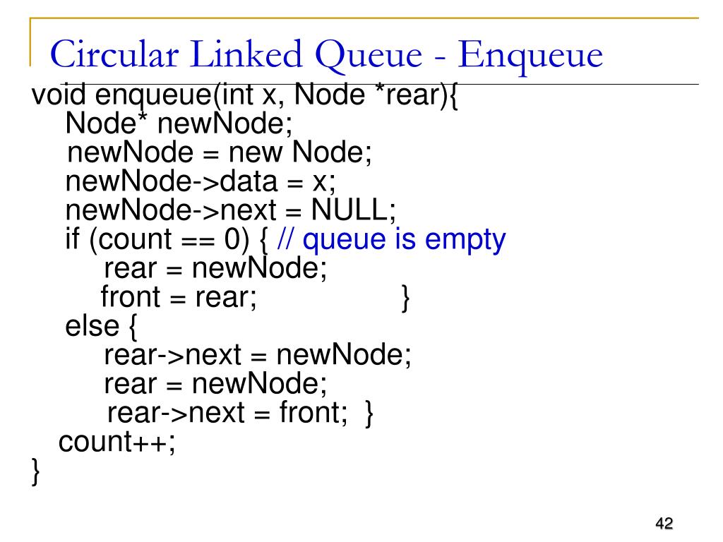 Circular Linked Queue - Enqueue void enqueue(int x, Node *rear){ Node* newNode; newNode = new Node; newNode->data = x; newNode->next = NULL; if (count == 0) { // queue is empty rear = newNode; front = rear; } else { rear->next = newNode; rear = newNode; rear->next = front; } count++; }