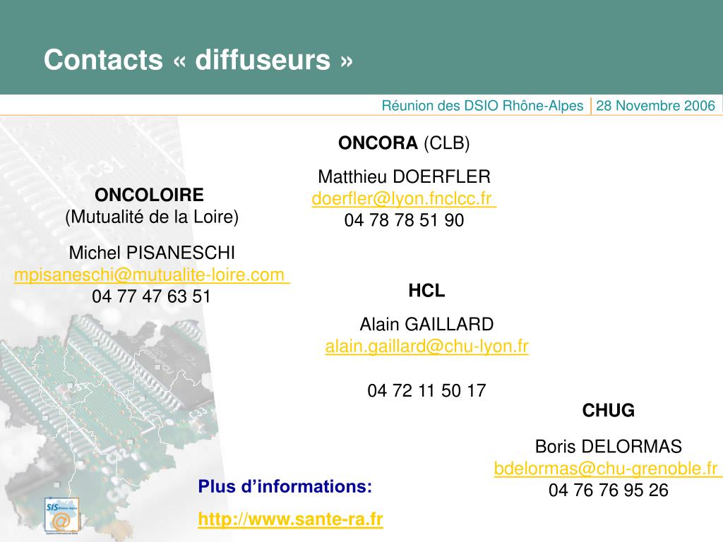 Contacts « diffuseurs » ONCORA (CLB) Matthieu DOERFLER doerfler@lyon.fnclcc.fr 04 78 78 51 90 HCL Alain GAILLARD alain.gaillard@chu-lyon.fr 04 72 11 50 17 ONCOLOIRE (Mutualité de la Loire) Michel PISANESCHI mpisaneschi@mutualite-loire.com 04 77 47 63 51 CHUG Boris DELORMAS bdelormas@chu-grenoble.fr 04 76 76 95 26 Plus d’informations: http://www.sante-ra.fr