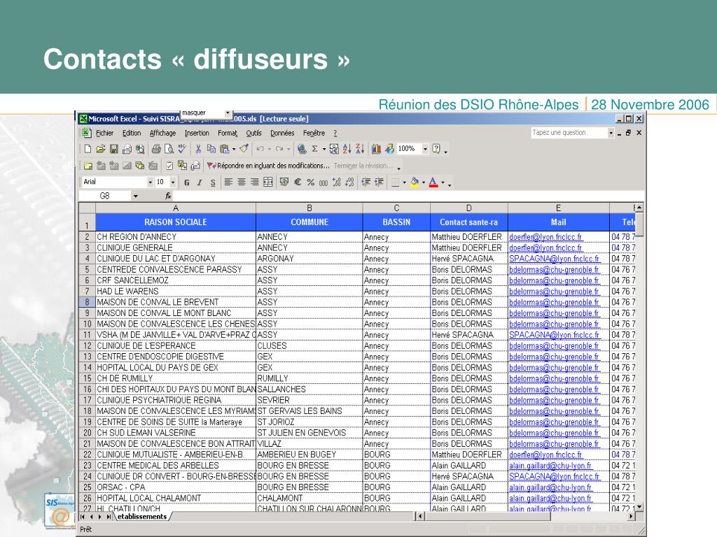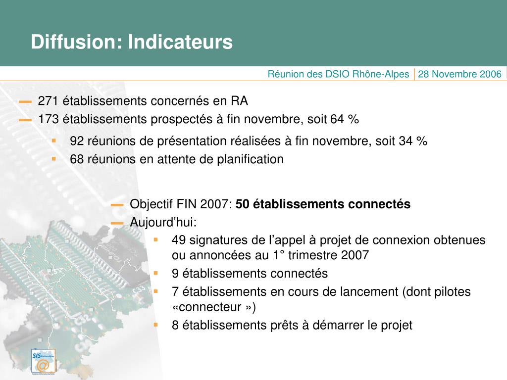 Diffusion: Indicateurs • 271 établissements concernés en RA • 173 établissements prospectés à fin novembre, soit 64 % • 92 réunions de présentation réalisées à fin novembre, soit 34 % • 68 réunions en attente de planification • Objectif FIN 2007: 50 établissements connectés • Aujourd’hui: • 49 signatures de l’appel à projet de connexion obtenues ou annoncées au 1° trimestre 2007 • 9 établissements connectés • 7 établissements en cours de lancement (dont pilotes «connecteur ») • 8 établissements prêts à démarrer le projet
