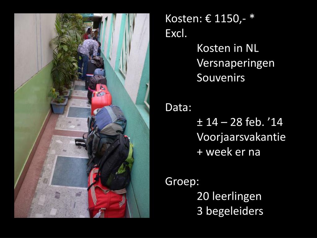 Kosten: € 1150,- * Excl. Kosten in NL Versnaperingen Souvenirs Data: ± 14 – 28 feb. ’14 Voorjaarsvakantie + week er na Groep: 20 leerlingen 3 begeleiders