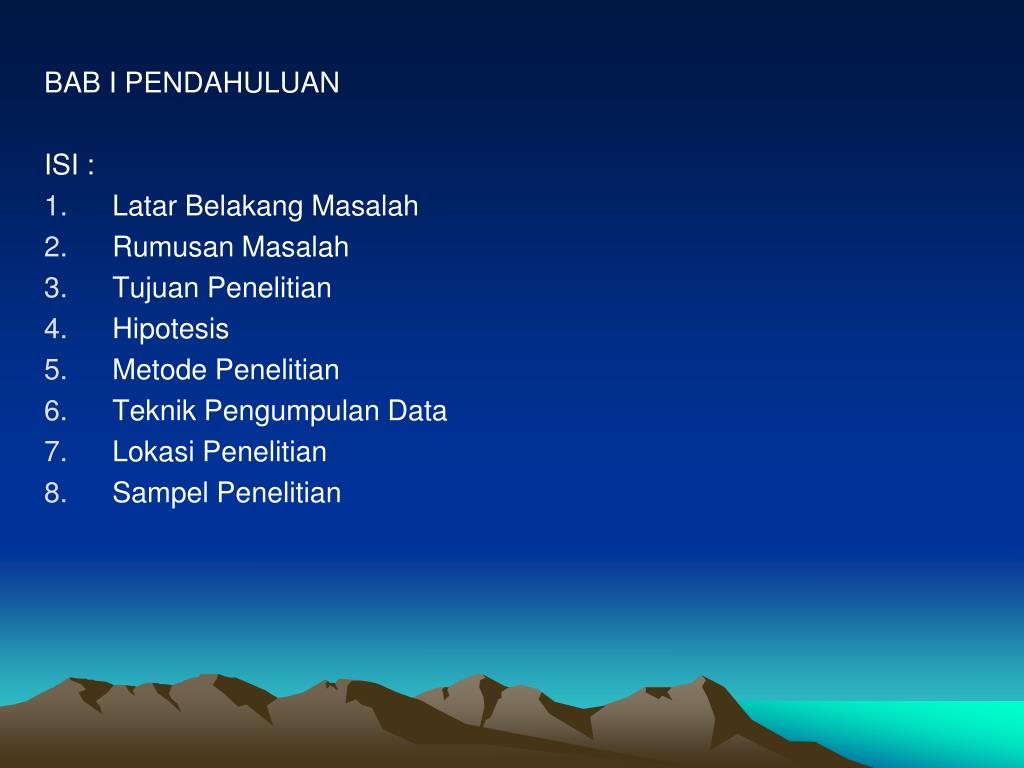 BAB I PENDAHULUAN ISI : • Latar Belakang Masalah • Rumusan Masalah • Tujuan Penelitian • Hipotesis • Metode Penelitian • Teknik Pengumpulan Data • Lokasi Penelitian • Sampel Penelitian