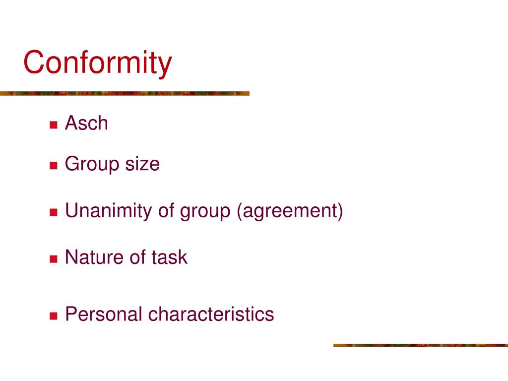 Conformity • Asch • Group size • Unanimity of group (agreement) • Nature of task • Personal characteristics