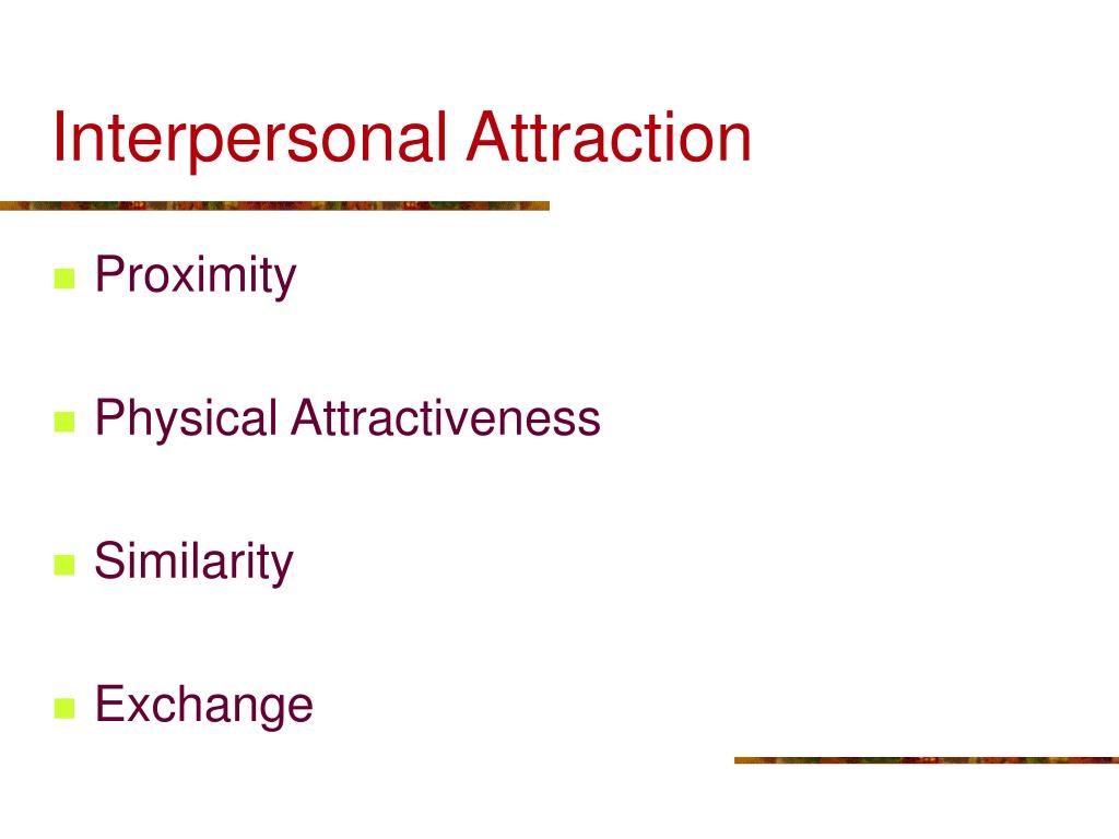 Interpersonal Attraction • Proximity • Physical Attractiveness • Similarity • Exchange