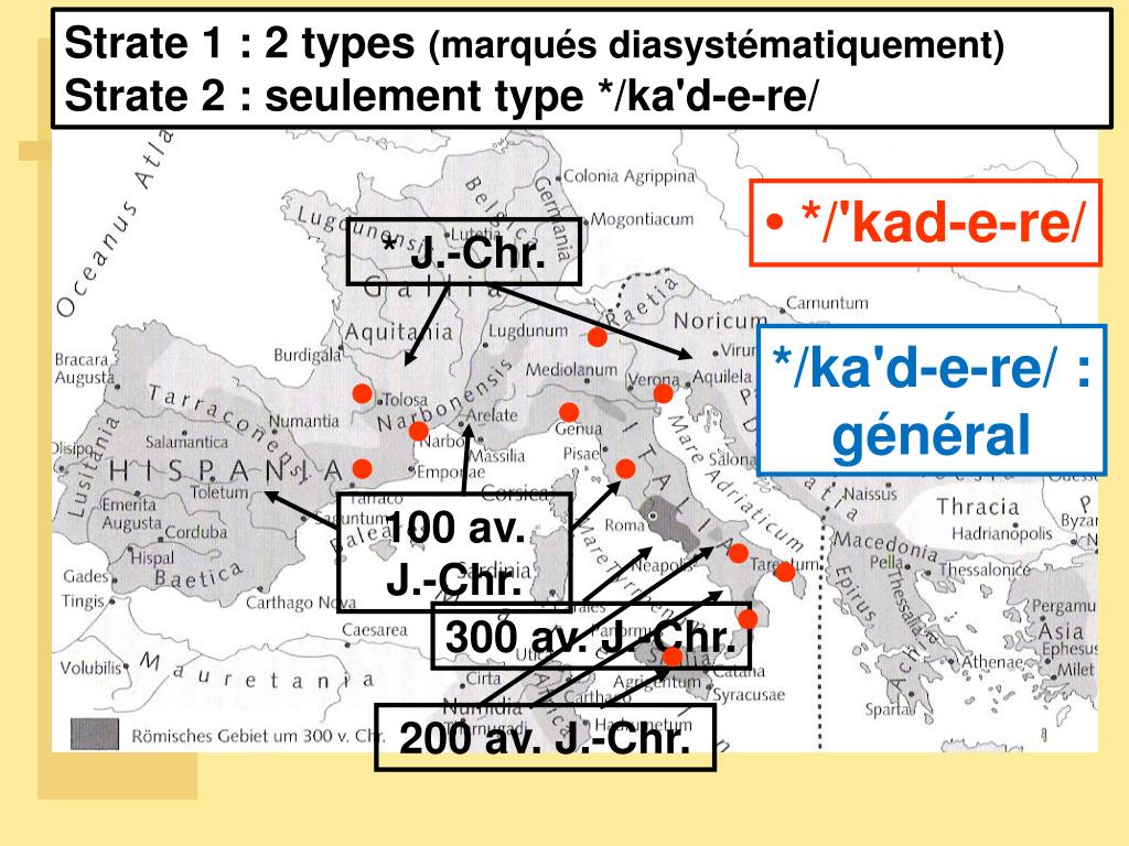 100 av. J.-Chr. Strate 1 : 2 types (marqués diasystématiquement) Strate 2 : seulement type */ka'd-e-re/ • */'kad-e-re/ * J.-Chr. */ka'd-e-re/ : général 300 av. J.-Chr. 200 av. J.-Chr.