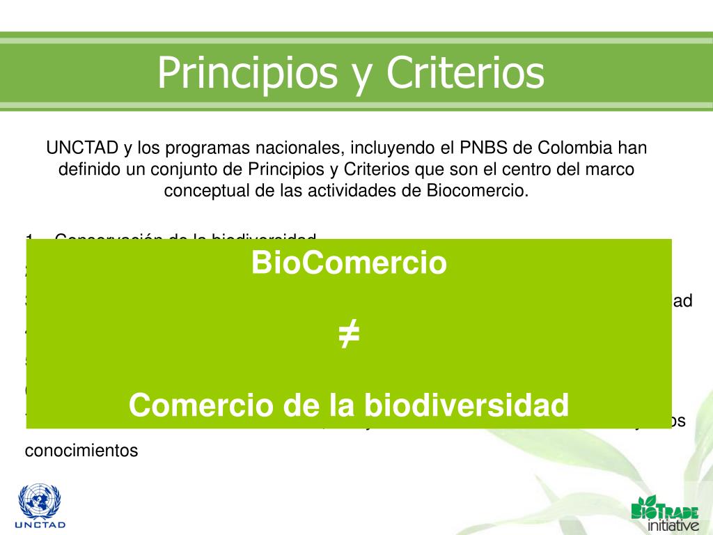Principios y Criterios UNCTAD y los programas nacionales, incluyendo el PNBS de Colombia han definido un conjunto de Principios y Criterios que son el centro del marco conceptual de las actividades de Biocomercio. 1 – Conservación de la biodiversidad 2 – Uso sostenible de la biodiversidad 3 – Distribución justa y equitativa de beneficios derivados del uso de la biodiversidad 4 – Sostenibilidad socio-económica 5 – Cumplimiento de legislación nacional e internacional 6 – Respeto de los derechos de los actores involucrados en el Biocomercio 7 – Claridad sobre tenencia de tierras, uso y acceso a los recursos naturales y a losconocimientos BioComercio ≠ Comercio de la biodiversidad