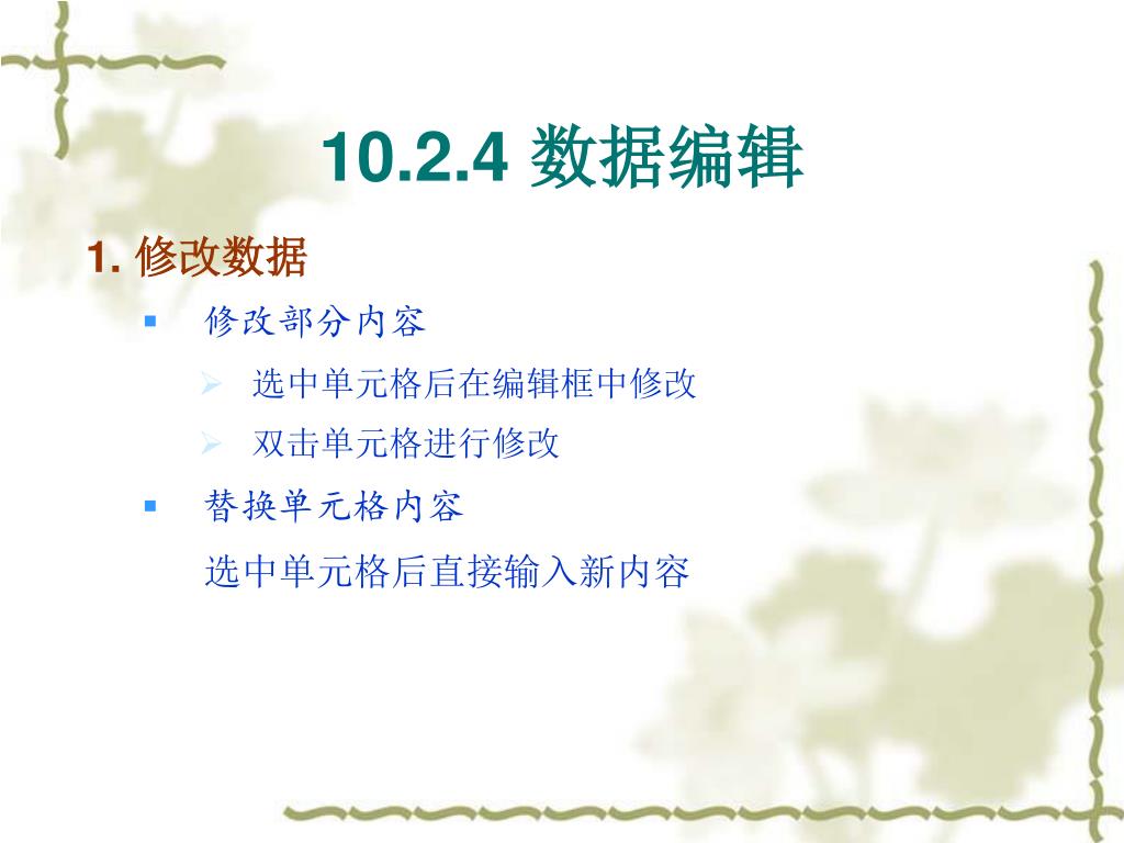 10.2.4 数据编辑 1. 修改数据 • 修改部分内容 • 选中单元格后在编辑框中修改 • 双击单元格进行修改 • 替换单元格内容 选中单元格后直接输入新内容