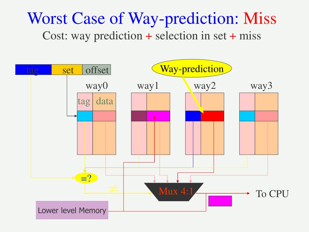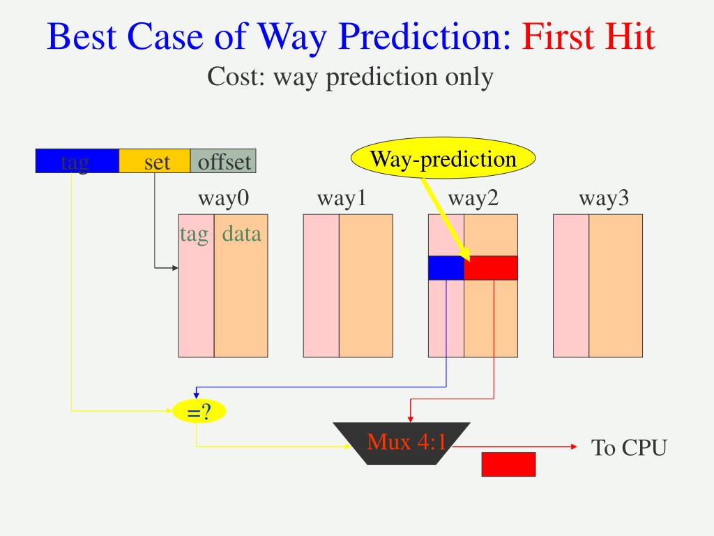 Way-prediction tag set offset =? Mux 4:1 To CPU Best Case of Way Prediction:First HitCost: way prediction only way0 way1 way2 way3 tag data