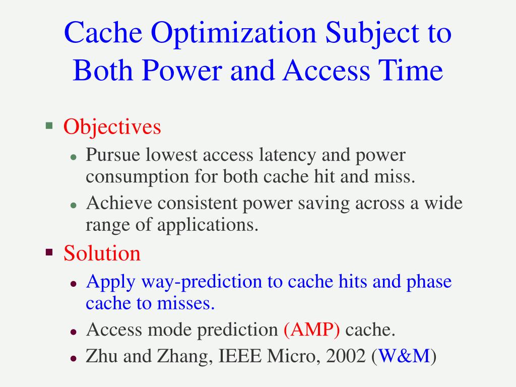 Cache Optimization Subject to Both Power and Access Time • Objectives • Pursue lowest access latency and power consumption for both cache hit and miss. • Achieve consistent power saving across a wide range of applications. • Solution • Apply way-prediction to cache hits and phase cache to misses. • Access mode prediction (AMP) cache. • Zhu and Zhang, IEEE Micro, 2002 (W&M)