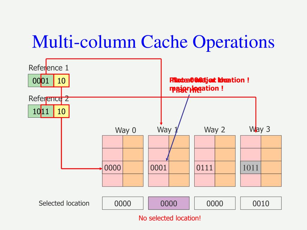 Reference 2 Reference 1 0001 1011 10 10 Place 0001 at the major location! Not at major location! First Hit! 0000 0000 1101 0001 0111 0111 1011 1011 0001 1101 1011 0000 No selected location! Multi-column Cache Operations Way 3 Way 1 Way 2 Way 0 0000 0000 0000 0010 Selected location