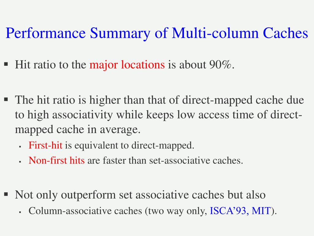 Performance Summary of Multi-column Caches • Hit ratio to the major locations is about 90%. • The hit ratio is higher than that of direct-mapped cache due to high associativity while keeps low access time of direct-mapped cache in average. • First-hit is equivalent to direct-mapped. • Non-first hits are faster than set-associative caches. • Not only outperform set associative caches but also • Column-associative caches (two way only, ISCA’93, MIT).