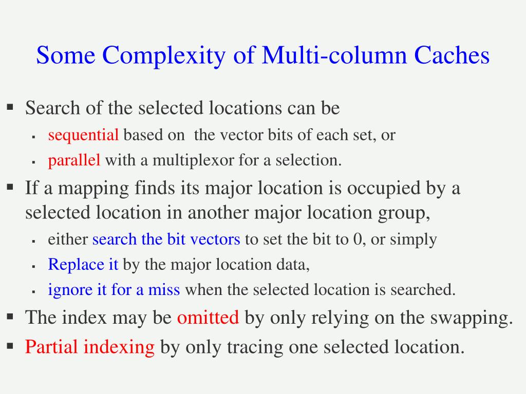 Some Complexity of Multi-column Caches • Search of the selected locations can be • sequential based on the vector bits of each set, or • parallel with a multiplexor for a selection. • If a mapping finds its major location is occupied by a selected location in another major location group, • either search the bit vectors to set the bit to 0, or simply • Replace it by the major location data, • ignore it for a miss when the selected location is searched. • The index may be omitted by only relying on the swapping. • Partial indexing by only tracing one selected location.