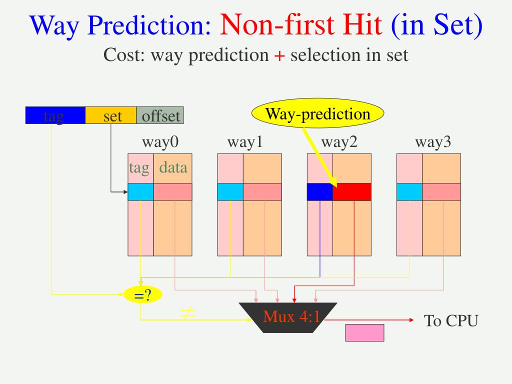 Way-prediction tag set offset =? Mux 4:1 To CPU Way Prediction:Non-first Hit (in Set)Cost: way prediction + selection in set way0 way1 way2 way3 tag data