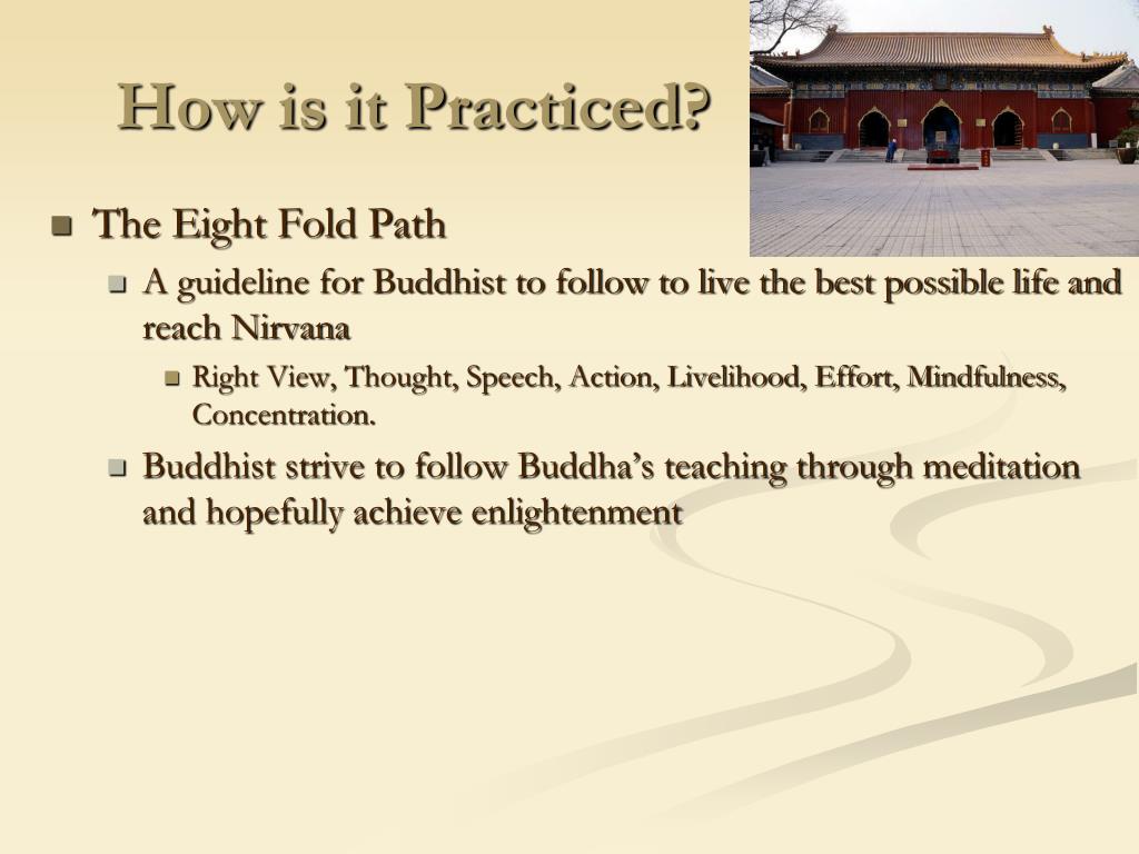 How is it Practiced? • The Eight Fold Path • A guideline for Buddhist to follow to live the best possible life and reach Nirvana • Right View, Thought, Speech, Action, Livelihood, Effort, Mindfulness, Concentration. • Buddhist strive to follow Buddha’s teaching through meditation and hopefully achieve enlightenment