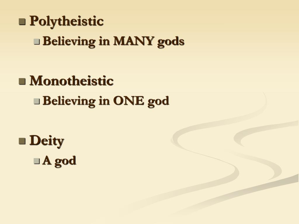 Polytheistic • Believing in MANY gods • Monotheistic • Believing in ONE god • Deity • A god