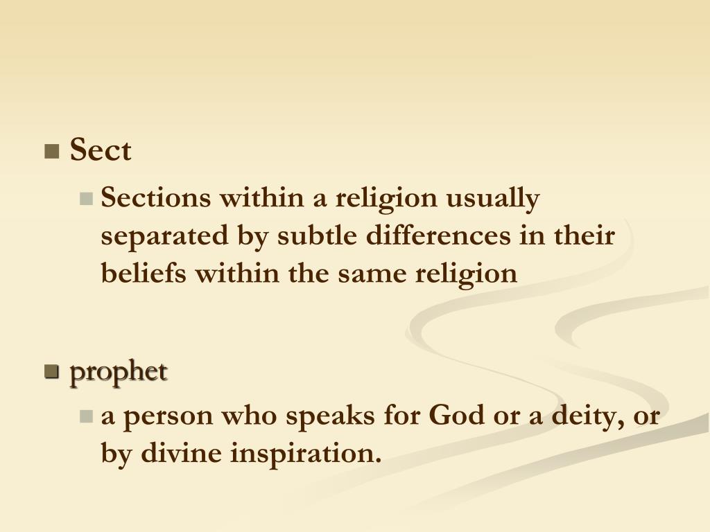 Sect • Sections within a religion usually separated by subtle differences in their beliefs within the same religion • prophet • a person who speaks for God or a deity, or by divine inspiration.
