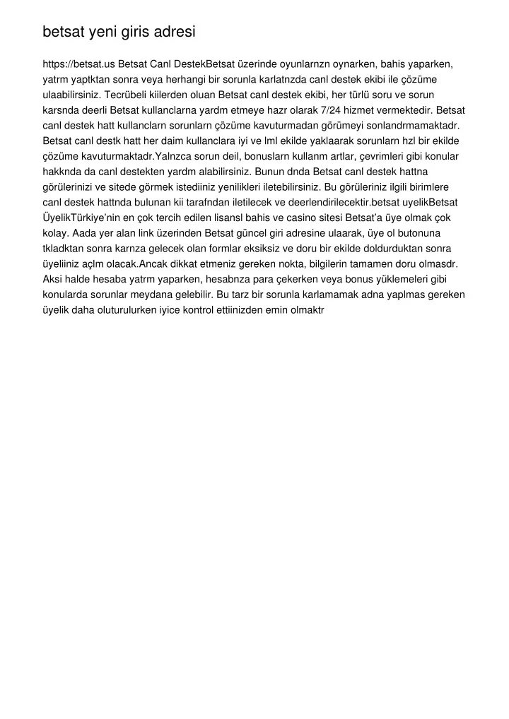 <a href="https://betsat.us">betsat yeni giriu015f adresi</a><br/><br/>Betsat Canlu0131 Destek<br/>Betsat u00fczerinde oyunlaru0131nu0131zu0131nu0131 oynarken, bahis yaparken, yatu0131ru0131m yaptu0131ktan sonra veya herhangi bir sorunla karu015fu0131lau015ftu0131u011fu0131nu0131zda canlu0131 destek ekibi ile u00e7u00f6zu00fcme ulau015fabilirsiniz. Tecru00fcbeli kiu015filerden oluu015fan Betsat canlu0131 destek ekibi, her tu00fcrlu00fc soru ve sorun karu015fu0131su0131nda deu011ferli Betsat kullanu0131cu0131laru0131na yardu0131m etmeye hazu0131r olarak 7/24 hizmet vermektedir. Betsat canlu0131 destek hattu0131 kullanu0131cu0131laru0131n sorunlaru0131nu0131 u00e7u00f6zu00fcme kavu