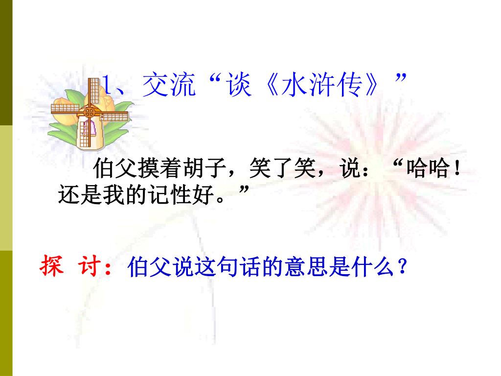 1、交流“谈《水浒传》” 伯父摸着胡子,笑了笑,说:“哈哈!还是我的记性好。” 探 讨:伯父说这句话的意思是什么?