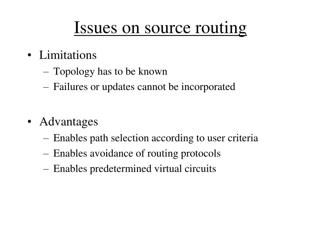 Issues on source routing • Limitations • Topology has to be known • Failures or updates cannot be incorporated • Advantages • Enables path selection according to user criteria • Enables avoidance of routing protocols • Enables predetermined virtual circuits