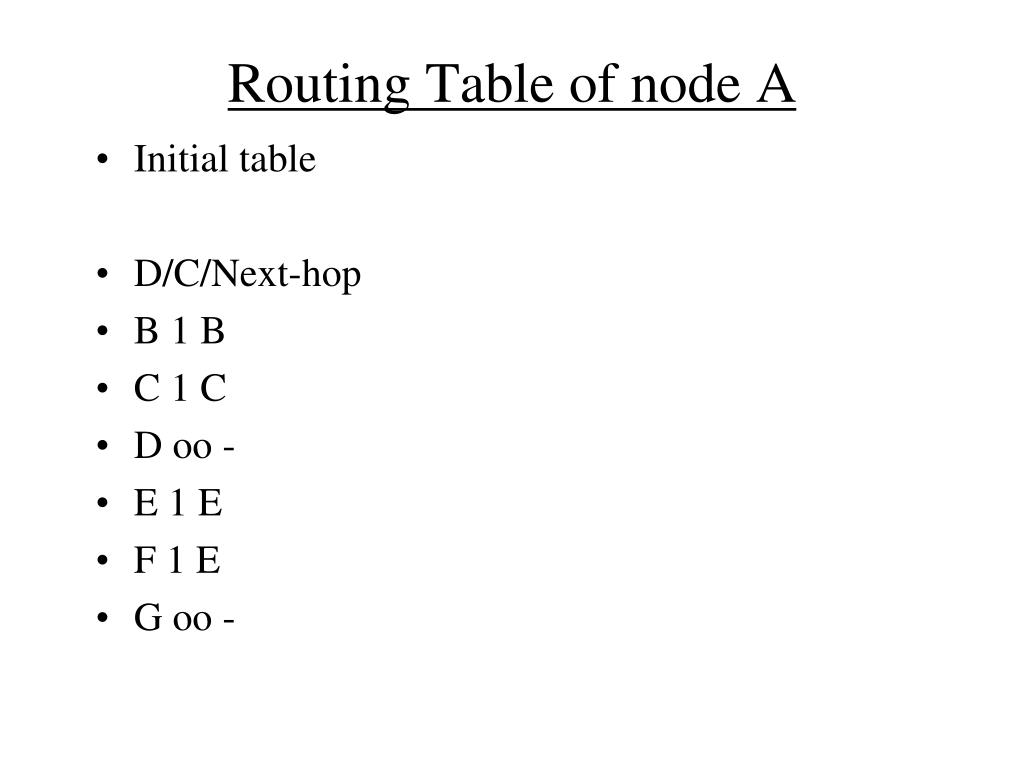 Routing Table of node A • Initial table • D/C/Next-hop • B 1 B • C 1 C • D oo - • E 1 E • F 1 E • G oo -
