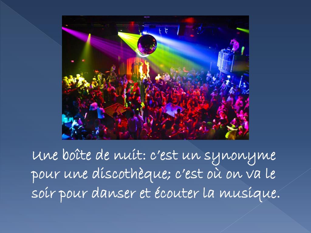 Uneboîte de nuit: c’est un synonyme pour une discothèque; c’estoù on va le soir pour danser et écouter la musique.