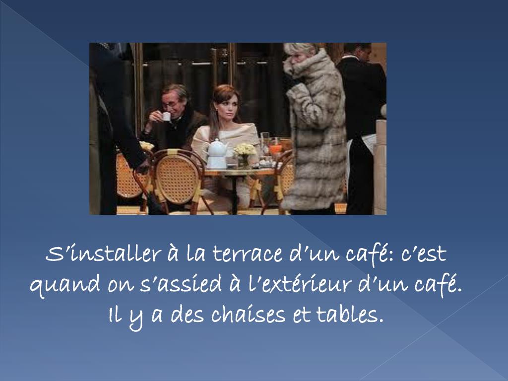 S’installer à la terrace d’un café: c’estquand on s’assied à l’extérieur d’un café. Il y a des chaises et tables.