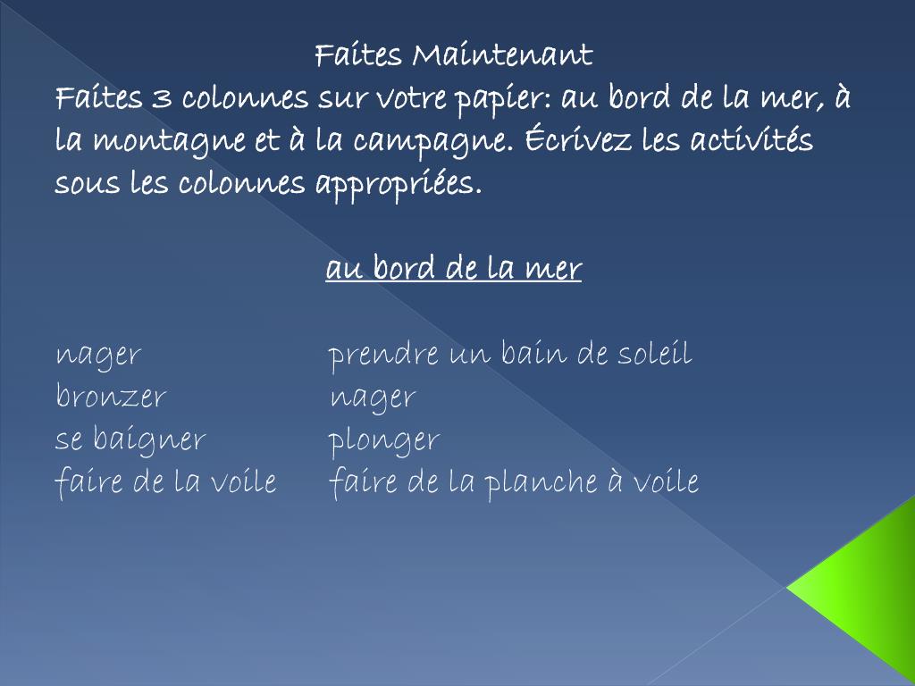 FaitesMaintenant • Faites 3 colonnessurvotrepapier: au bord de la mer, à la montagne et à la campagne. Écrivez les activités sous les colonnesappropriées. • au bord de la mer • nagerprendre un bain de soleil • bronzer nager • se baignerplonger • faire de la voile faire de la planche à voile