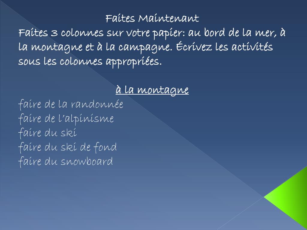 FaitesMaintenant • Faites 3 colonnessurvotrepapier: au bord de la mer, à la montagne et à la campagne. Écrivez les activités sous les colonnesappropriées. • à la montagne • faire de la randonnée • faire de l’alpinisme • faire du ski • faire du ski de fond • faire du snowboard