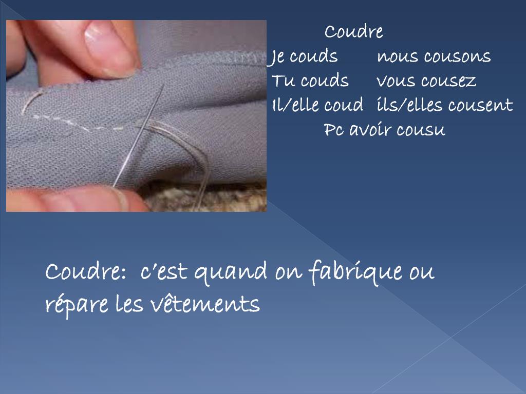 Coudre Je couds nous cousons Tucoudsvouscousez Il/ellecoudils/ellescousent Pc avoircousu Coudre: c’estquand on fabriqueourépare les vêtements