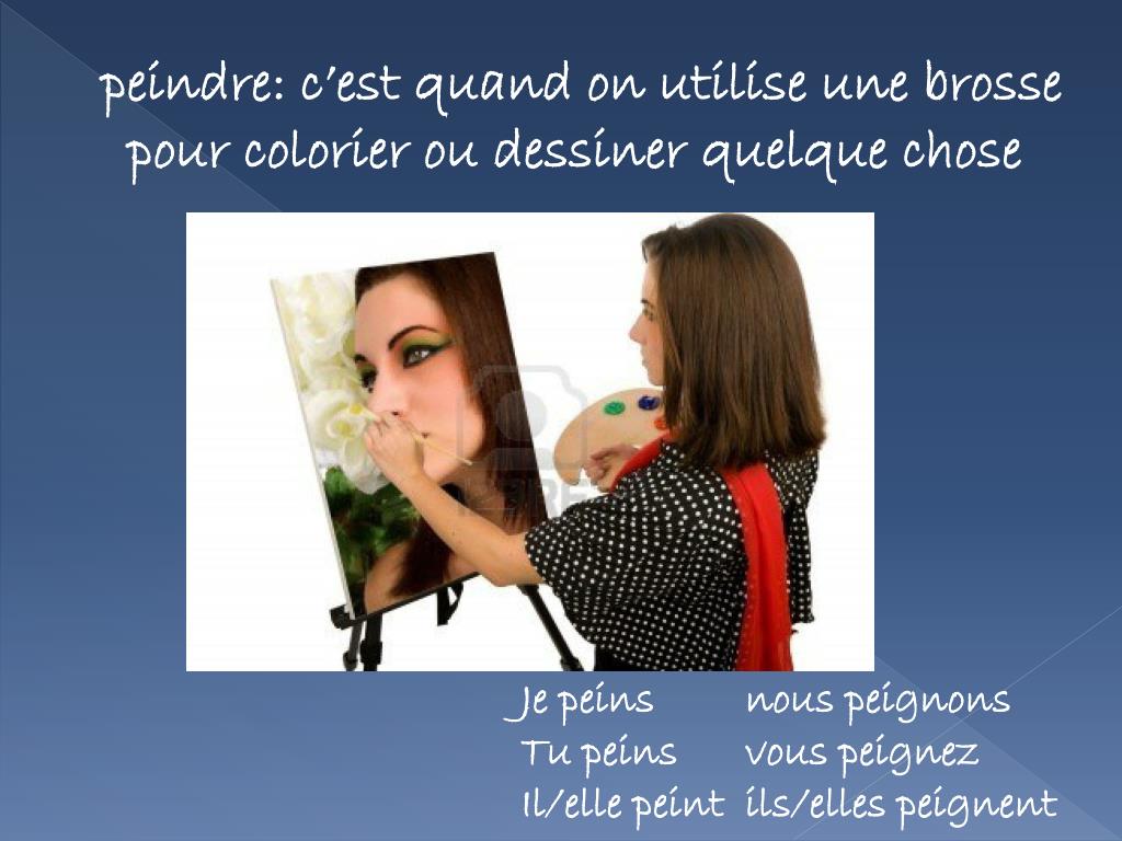 peindre: c’estquand on utiliseunebrosse pour colorieroudessinerquelque chose • Je peins nous peignons • Tupeinsvouspeignez • Il/ellepeintils/ellespeignent