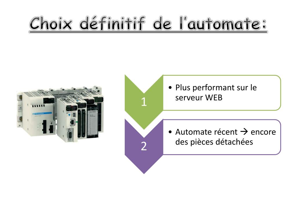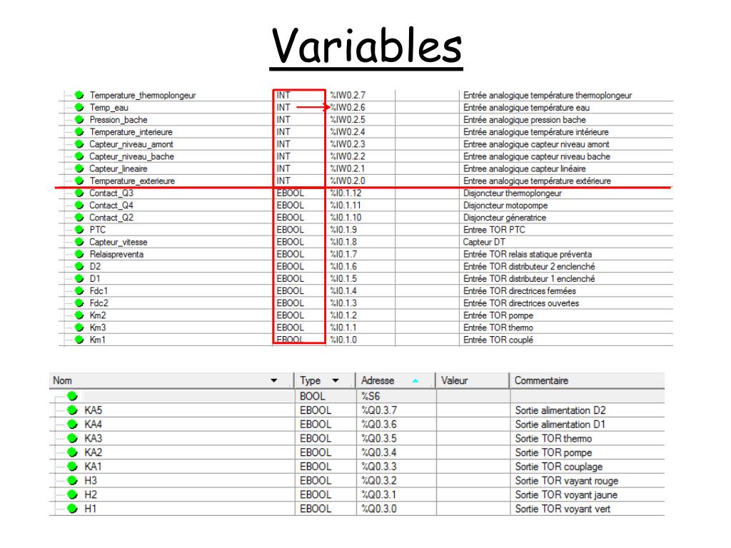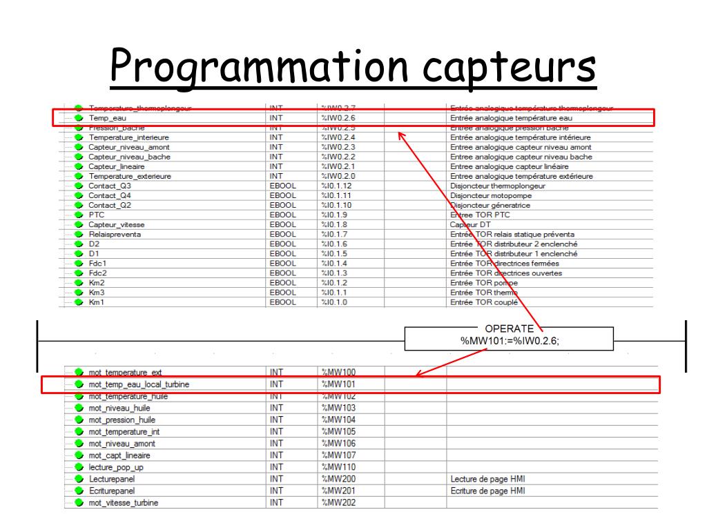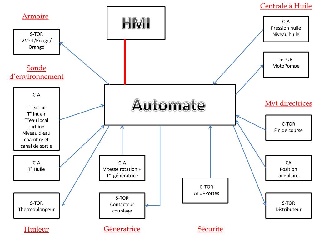 Centrale à Huile Armoire HMI C-A Pression huile Niveau huile S-TOR V.Vert/Rouge/ Orange S-TOR MotoPompe Sonde d’environnement C-A T° ext air T° int air T°eau local turbine Niveau d’eau chambre et canal de sortie Automate Mvt directrices C-TOR Fin de course C-A T° Huile C-A Vitesse rotation + T° génératrice CA Position angulaire 0 E-TOR ATU+Portes S-TOR Contacteur couplage S-TOR Thermoplongeur S-TOR Distributeur Génératrice Sécurité Huileur
