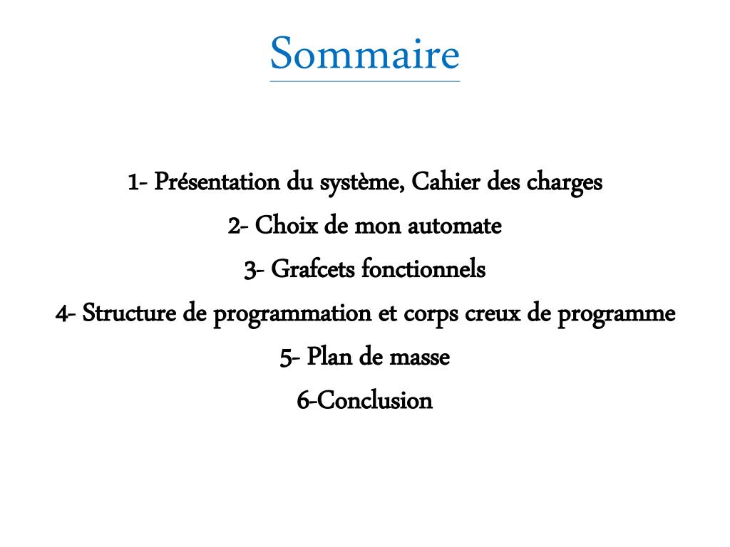 Sommaire 1- Présentation du système, Cahier des charges 2- Choix de mon automate 3- Grafcets fonctionnels 4- Structure de programmation et corps creux de programme 5- Plan de masse 6-Conclusion