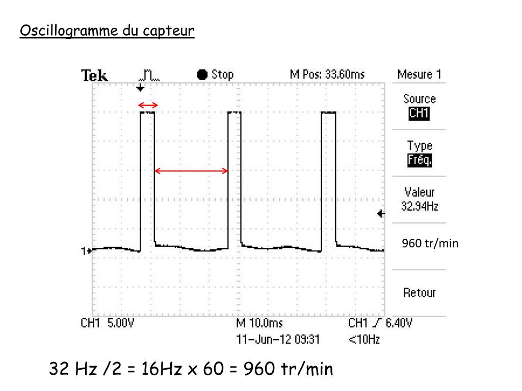 Oscillogramme du capteur 960 tr/min 32 Hz /2 = 16Hz x 60 = 960 tr/min