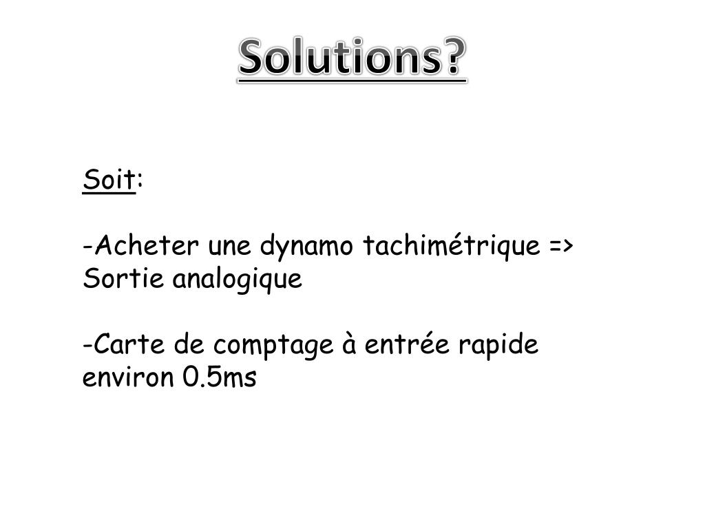 Solutions? Soit: -Acheter une dynamo tachimétrique => Sortie analogique -Carte de comptage à entrée rapide environ 0.5ms