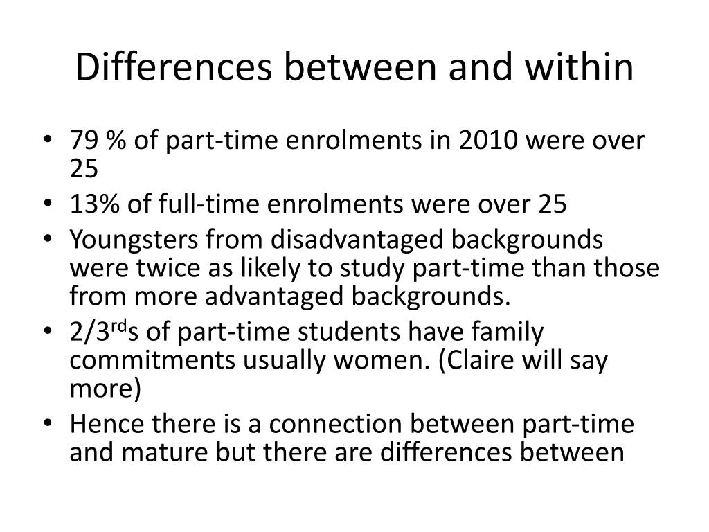Differences between and within • 79 % of part-time enrolments in 2010 were over 25 • 13% of full-time enrolments were over 25 • Youngsters from disadvantaged backgrounds were twice as likely to study part-time than those from more advantaged backgrounds. • 2/3rds of part-time students have family commitments usually women. (Claire will say more) • Hence there is a connection between part-time and mature but there are differences between