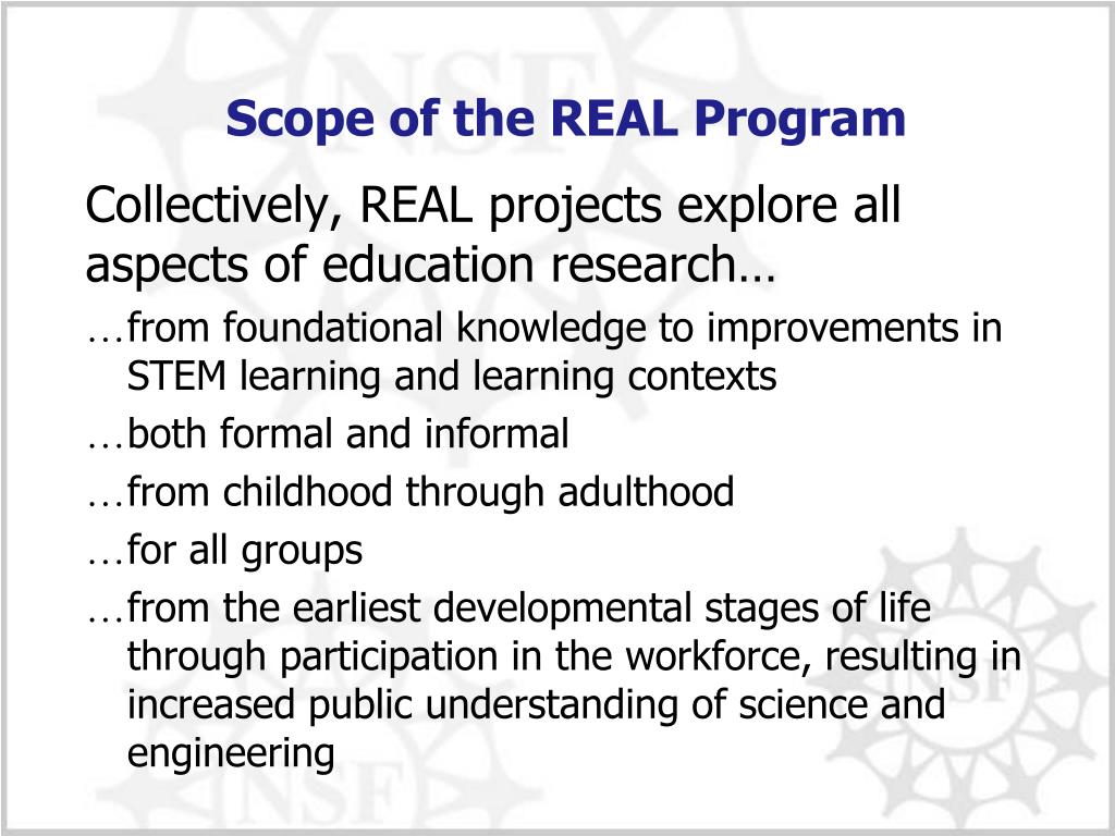 Scope of the REAL Program Collectively, REAL projects explore all aspects of education research… • from foundational knowledge to improvements in STEM learning and learning contexts • both formal and informal • from childhood through adulthood • for all groups • from the earliest developmental stages of life through participation in the workforce, resulting in increased public understanding of science and engineering