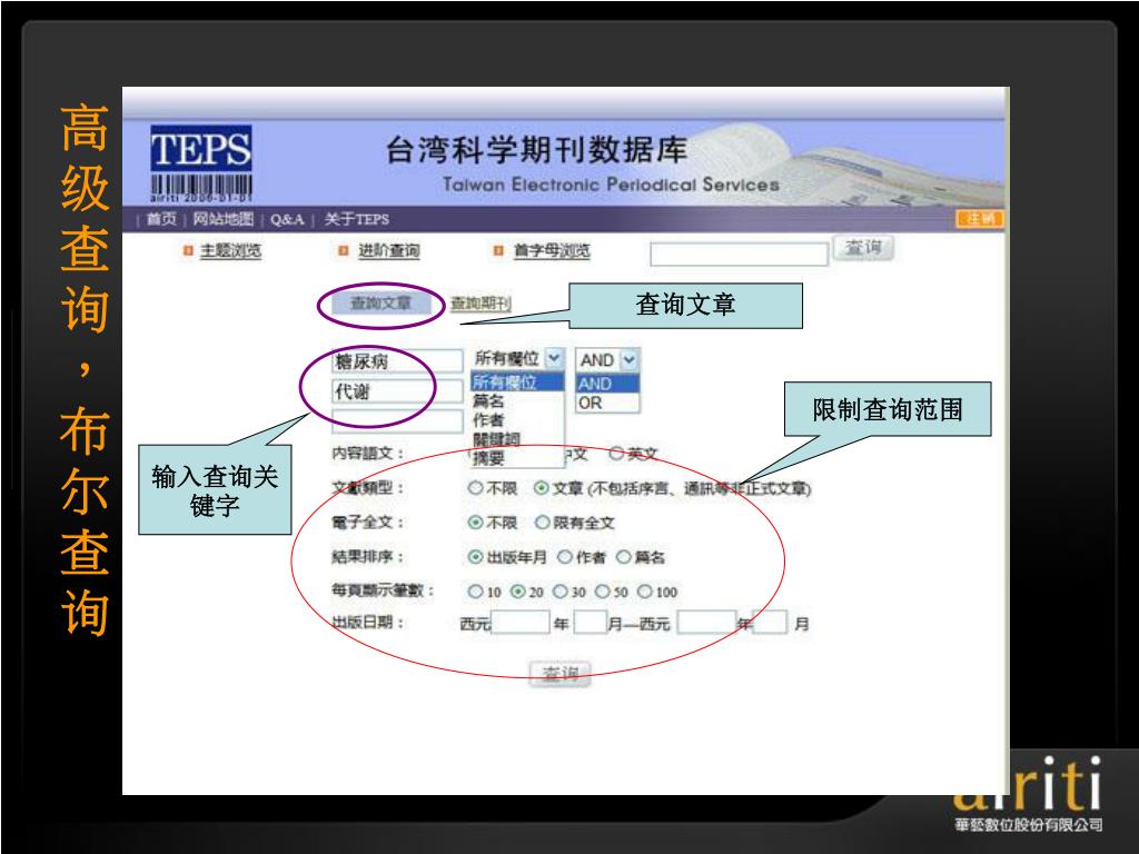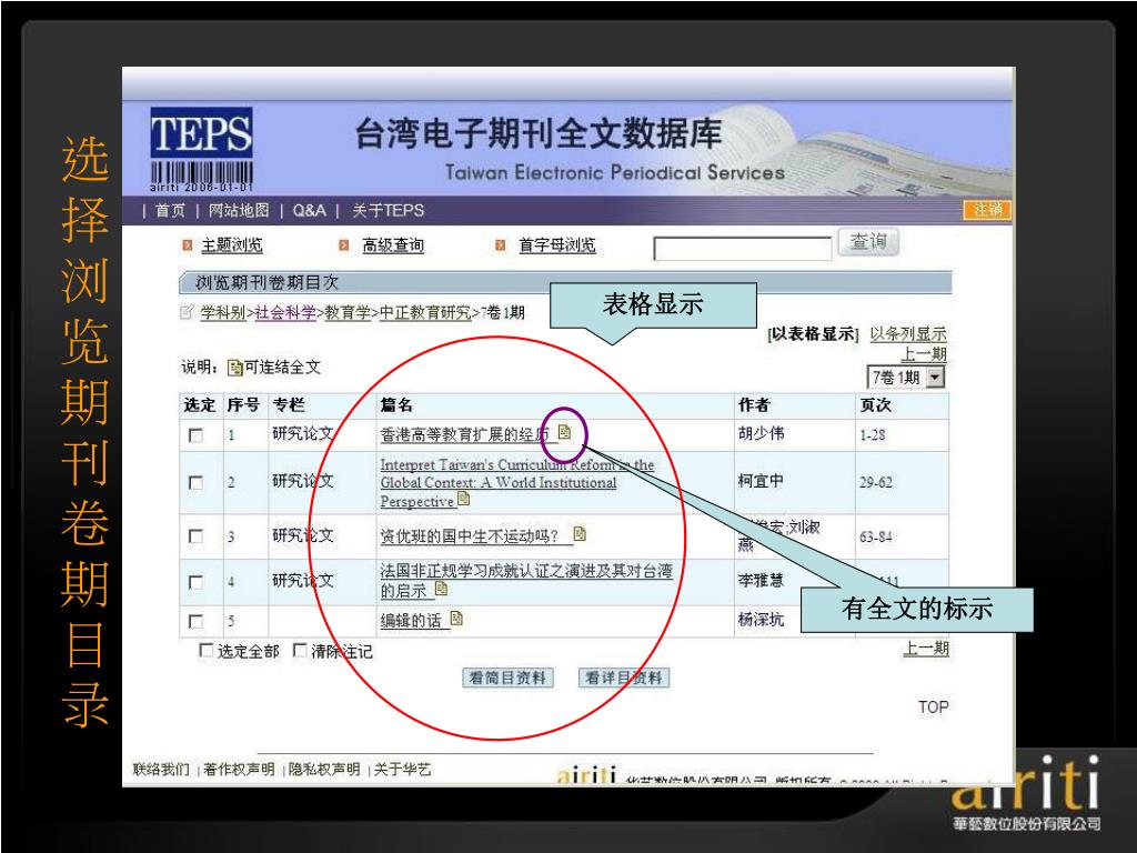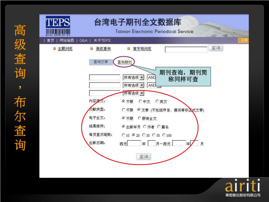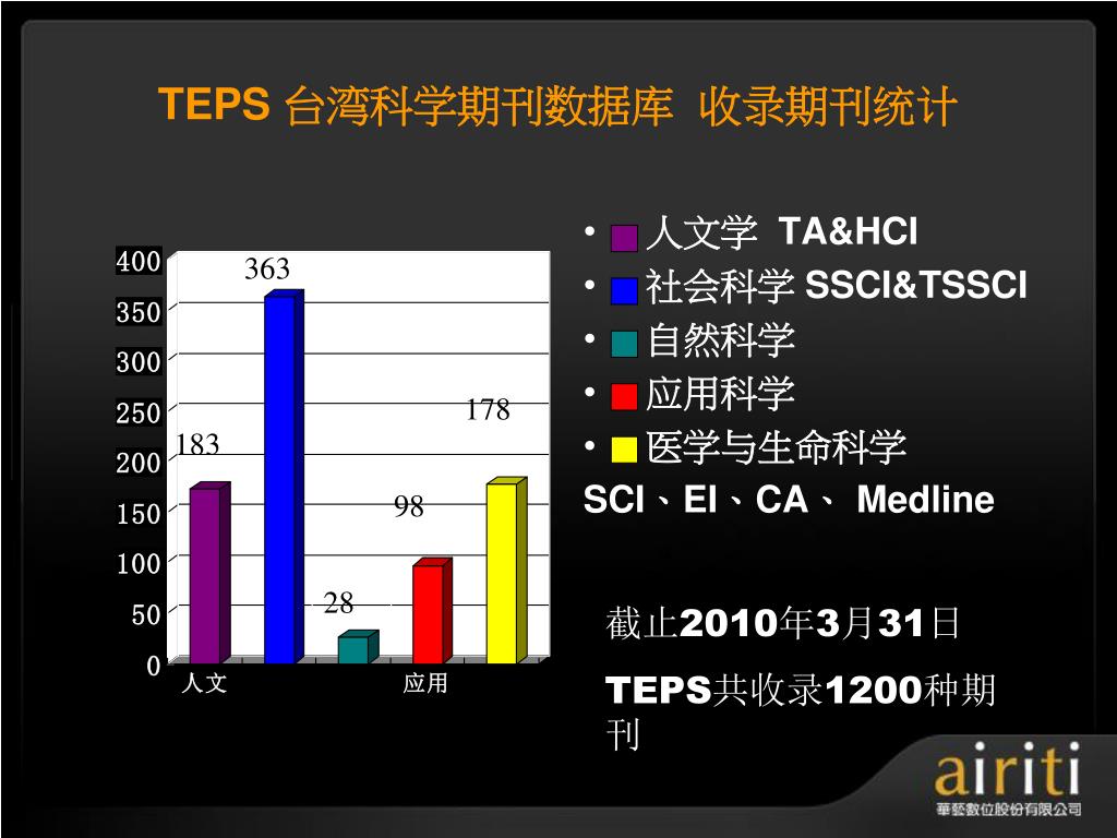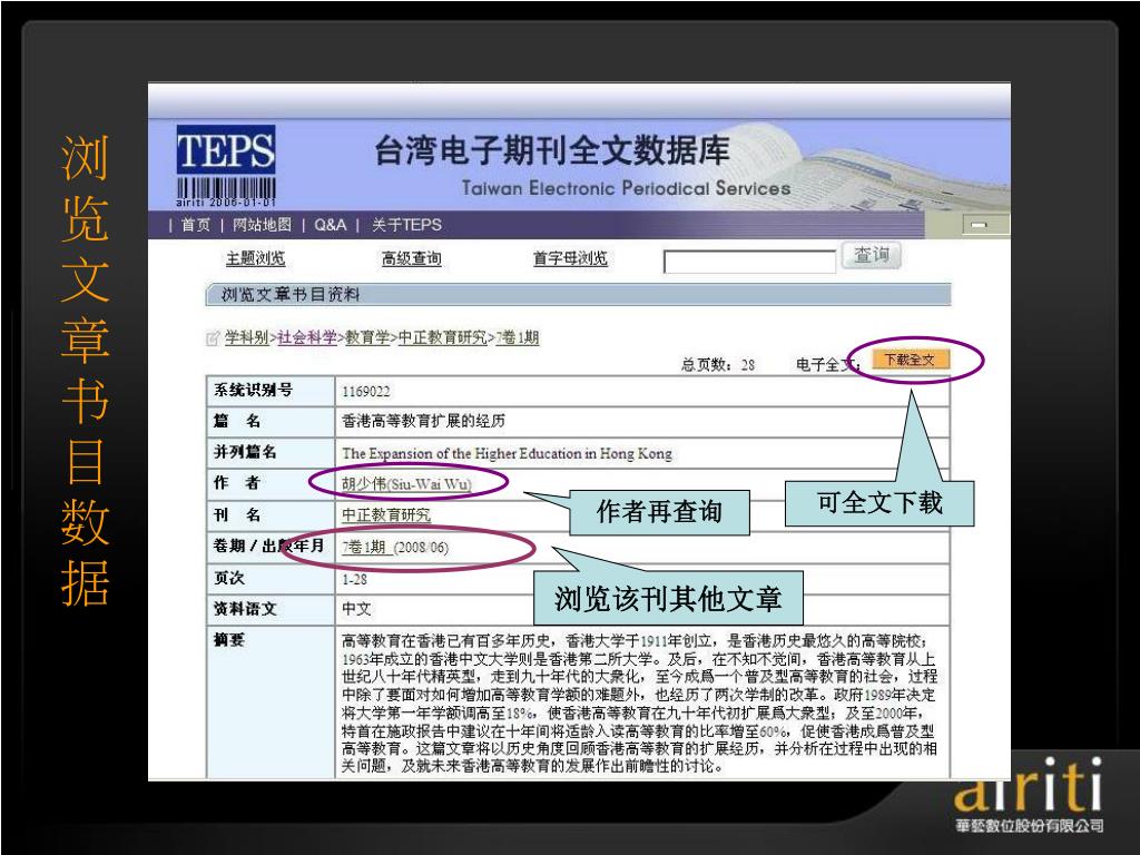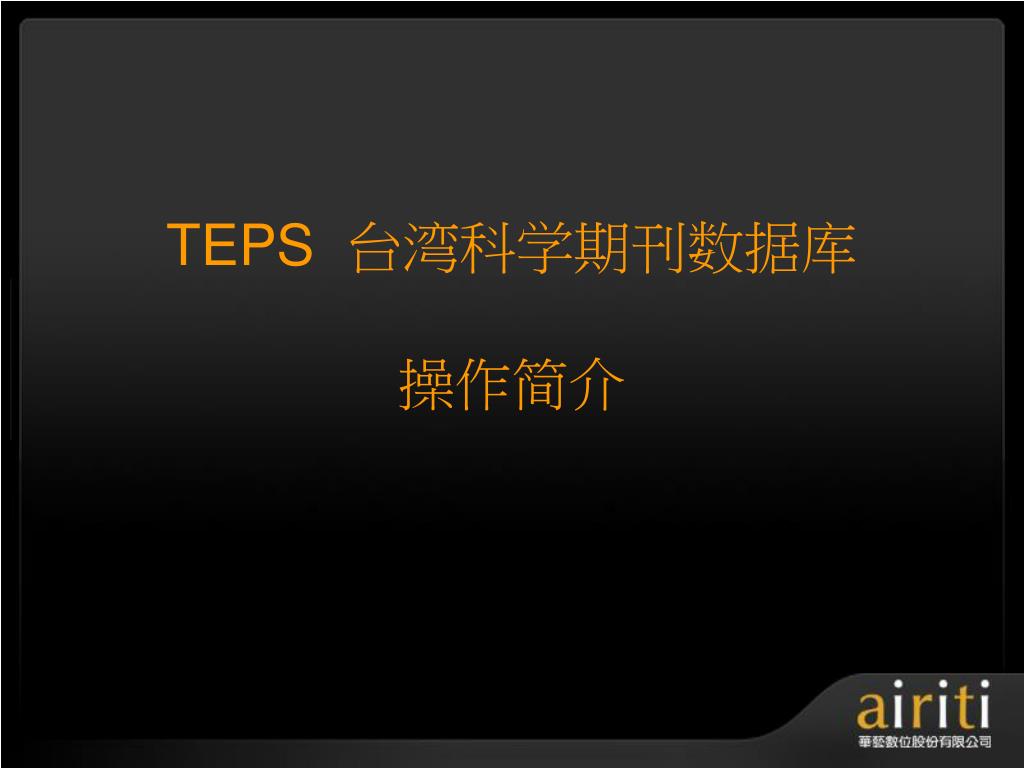 å°æ¹¾åŽè‰ºç”µå期刊数æ®åº“ æ“作方法与技巧 Taiwan Electronic Periodical Services. 主讲人 :. æŽ è½©. åŽè‰ºæ•°ä½å…¬å¸ç®€ä»‹. åŽè‰ºæ•°ä½ ( 股份 ) å…¬å¸ ( 以下简称åŽè‰ºæ•°ä½ ) æˆç«‹äºŽ 2000 å¹´ä¸å›½å°æ¹¾ï¼Œå¹¶äºŽ 2005 年于北京æ£å¼æˆç«‹åŒ—äº¬é¸¿å¦æ•°å—科技有é™å…¬å¸ï¼Œç§‰æŒã€Œ æ•°ä½åŽæ–‡å†…容,创新知识æœåŠ¡ ã€çš„ç†å¿µï¼Œä»¥ä¸“业的著作æƒå¾é›†ä¸Žæ•°ä½å·¥ç¨‹çš„æœåŠ¡æœºåˆ¶ï¼Œå·²æˆåŠŸåœ°å°†è®¸å¤šåŽæ–‡çš„æ™ºè¯†èµ„äº§å®Œæˆæ•°ä½æ•´åˆã€åŠ å€¼ä¸Žè¥é”€ã€‚. åŽè‰ºæ•°ä½äº§å“的内容. TEPS å°æ¹¾ç§‘妿œŸåˆŠæ•°æ®åº“ ( www . teps .com.tw )