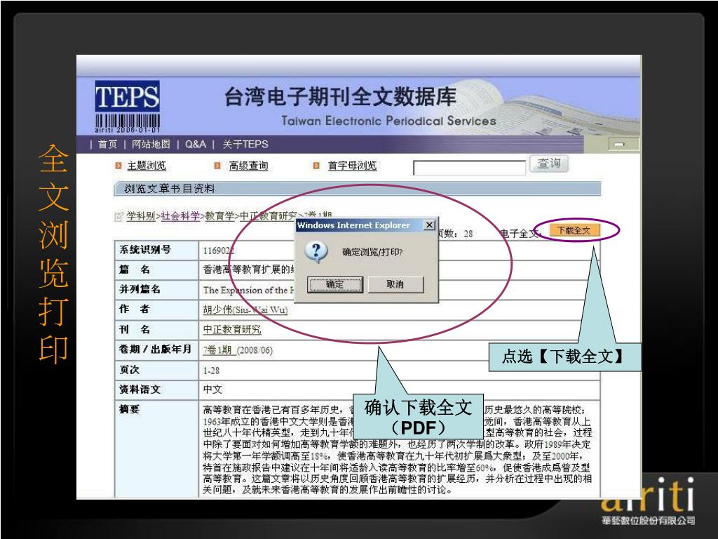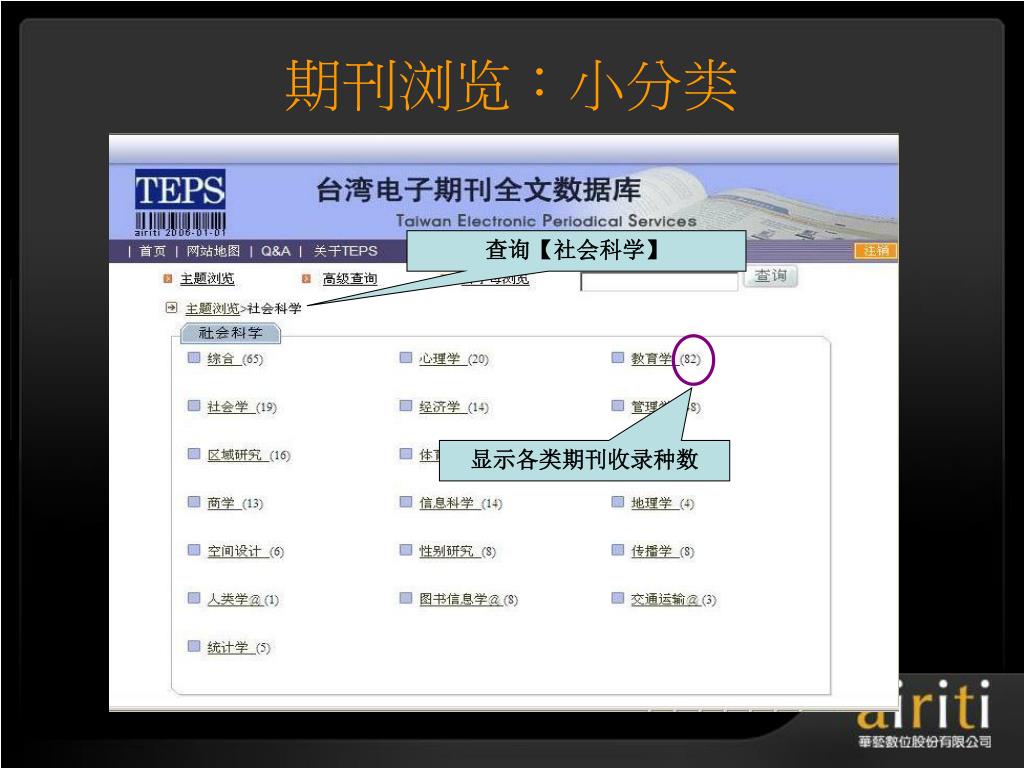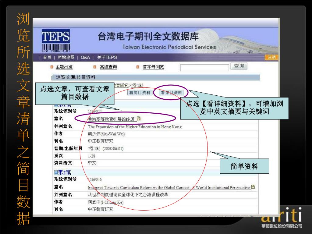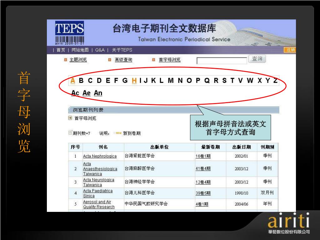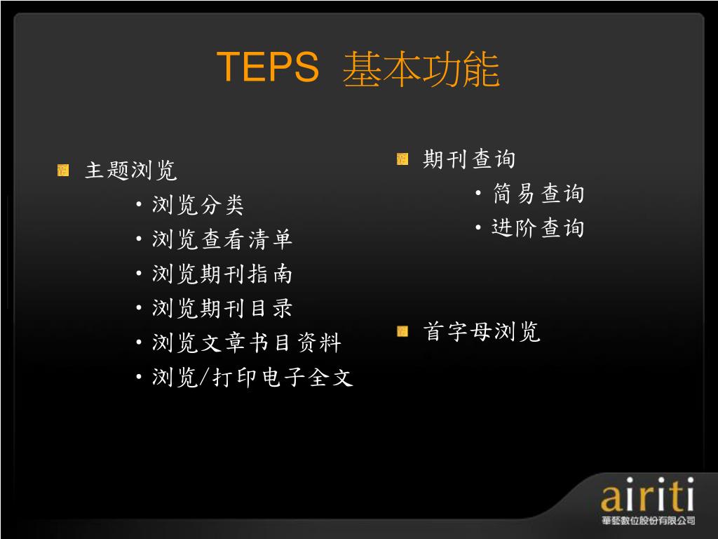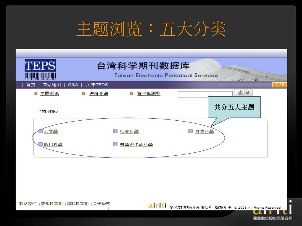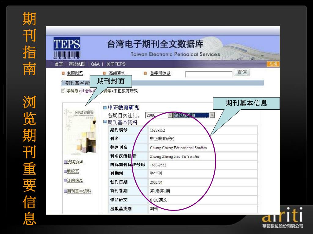 å°æ¹¾åŽè‰ºç”µå期刊数æ®åº“ æ“作方法与技巧 Taiwan Electronic Periodical Services. 主讲人 :. æŽ è½©. åŽè‰ºæ•°ä½å…¬å¸ç®€ä»‹. åŽè‰ºæ•°ä½ ( 股份 ) å…¬å¸ ( 以下简称åŽè‰ºæ•°ä½ ) æˆç«‹äºŽ 2000 å¹´ä¸å›½å°æ¹¾ï¼Œå¹¶äºŽ 2005 年于北京æ£å¼æˆç«‹åŒ—äº¬é¸¿å¦æ•°å—科技有é™å…¬å¸ï¼Œç§‰æŒã€Œ æ•°ä½åŽæ–‡å†…容,创新知识æœåŠ¡ ã€çš„ç†å¿µï¼Œä»¥ä¸“业的著作æƒå¾é›†ä¸Žæ•°ä½å·¥ç¨‹çš„æœåŠ¡æœºåˆ¶ï¼Œå·²æˆåŠŸåœ°å°†è®¸å¤šåŽæ–‡çš„æ™ºè¯†èµ„äº§å®Œæˆæ•°ä½æ•´åˆã€åŠ å€¼ä¸Žè¥é”€ã€‚. åŽè‰ºæ•°ä½äº§å“的内容. TEPS å°æ¹¾ç§‘妿œŸåˆŠæ•°æ®åº“ ( www . teps .com.tw )