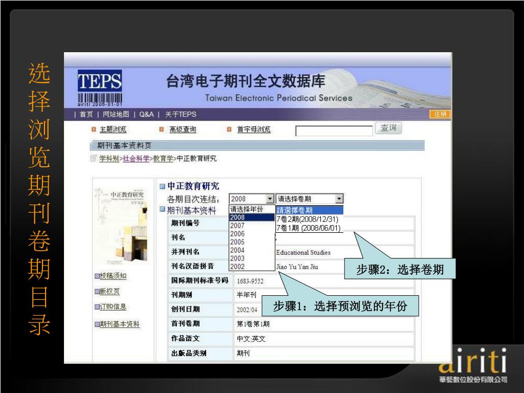 选择浏览期刊卷期目录 步骤2:选择卷期 步骤1:选择预浏览的年份