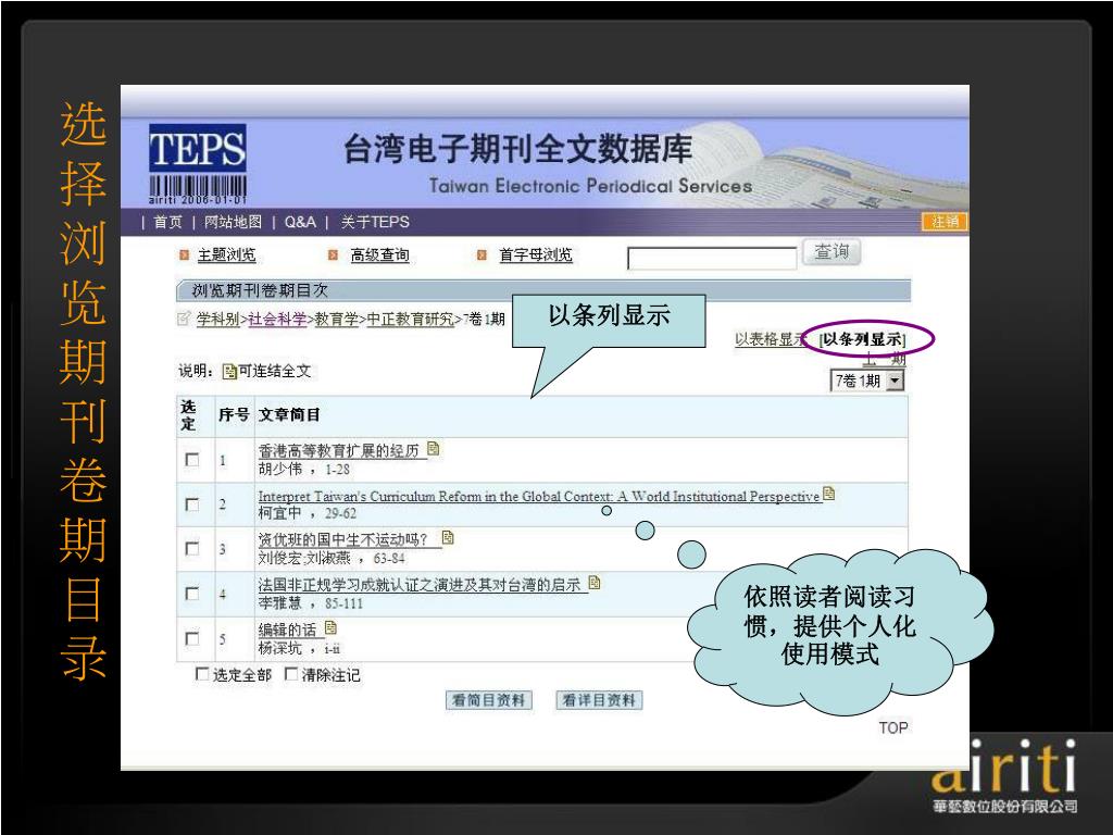 选择浏览期刊卷期目录 以条列显示 依照读者阅读习惯,提供个人化使用模式